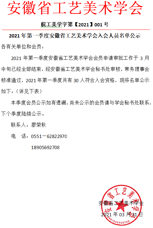 2021年第一季度安徽省工艺美术学会入会人员名单公示