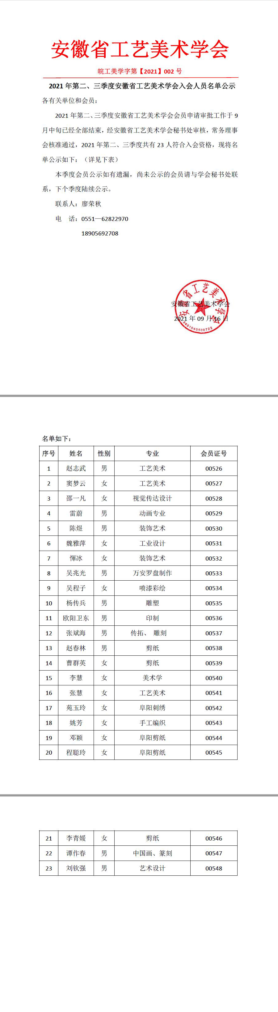 2021年第二、三季度安徽省工艺美术学会入会人员名单公示 来源:安徽省工艺美术学会 发布时间:2021年9月17日 浏览次数:3343 2021年第二、三季度安徽省工艺美术学会入会人员名单公示 安徽省工艺美术学会微信公众号 扫码关注我们